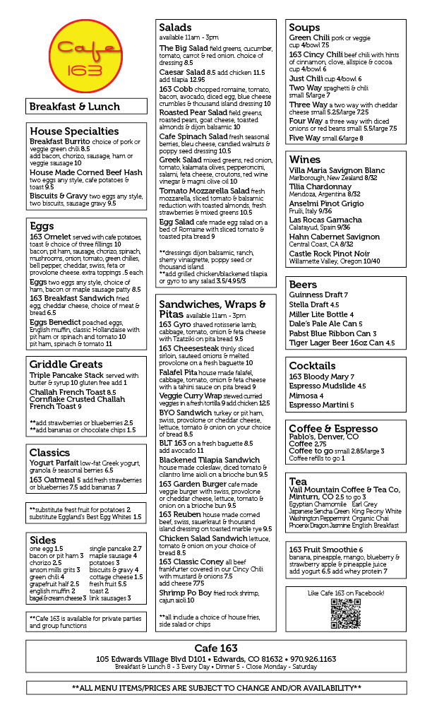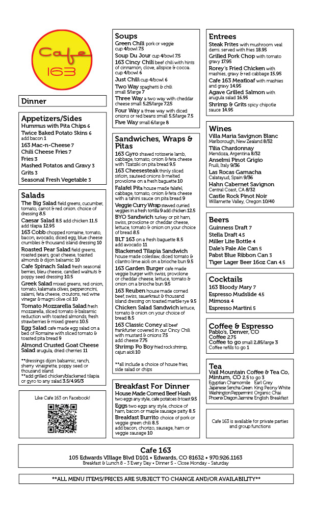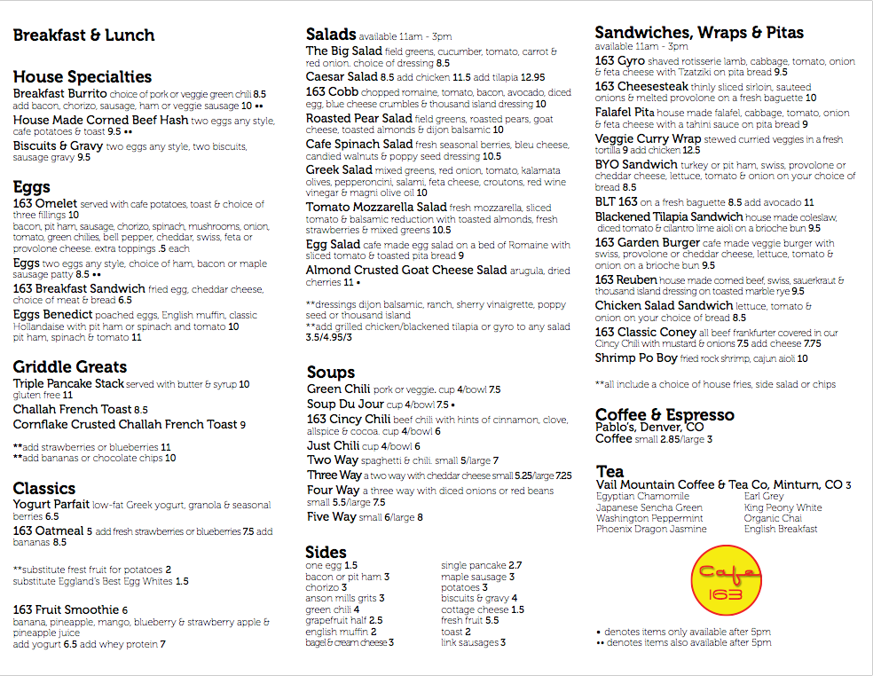 Menu for Cafe 163. Cafe 163 needed a new menu. I worked with them on changing the design so it evokes the idea of a diner menu, with consistency through all three different menus (takeout, dinner, lunch).